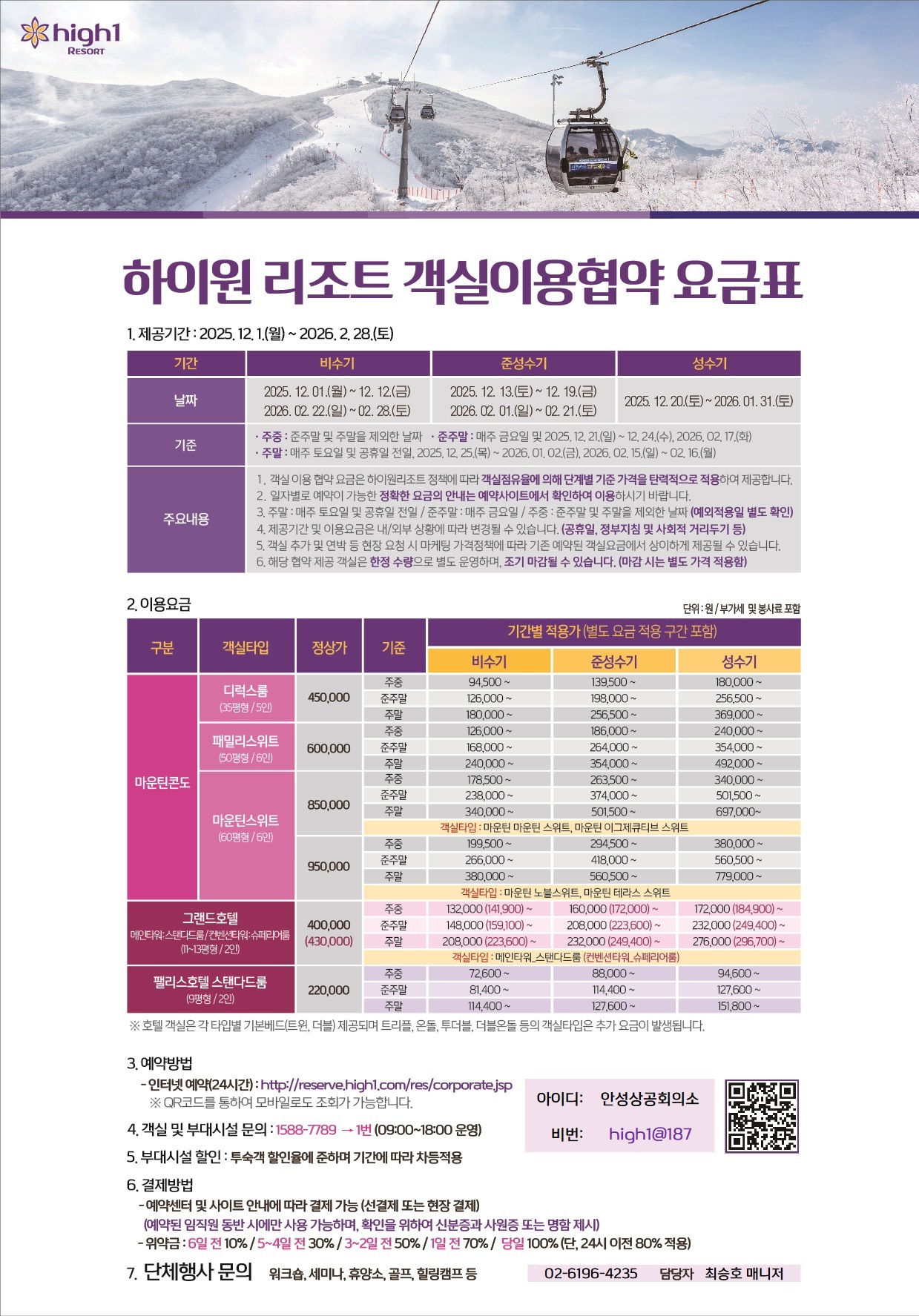 ▶ 하이원리조트 - 이용안내 : 하이원리조트 객실 및 부대시설 할인 - 이용기간 : ~ 2026년 2월 28일까지 - 예약방법 : 법인전용사이트 접속 (클릭) * 로그인 ID(안성상공회의소) / PW(high1@187) 입력