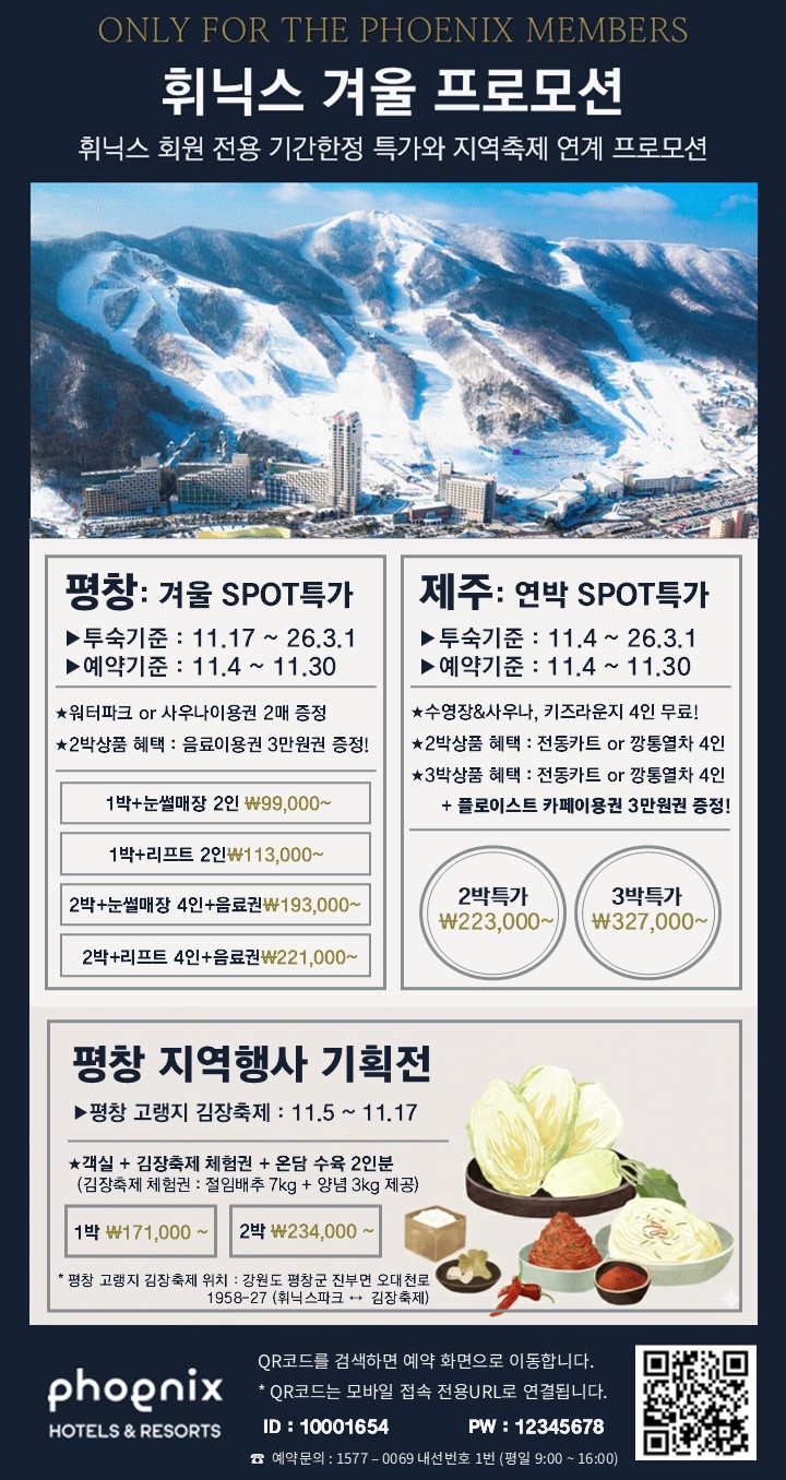 ▶ 휘닉스평창 - 이용안내 : 휘닉스평창, 제주 객실 및 부대시설 할인 - 예약기간 : 2025.11.01.~2025.11.30. - 이용기간 : 2025.11.01.~2026.02.28. - 예약방법 : 간편 예약 시스템 PC예약(클릭), 모바일예약(클릭), QR 예약