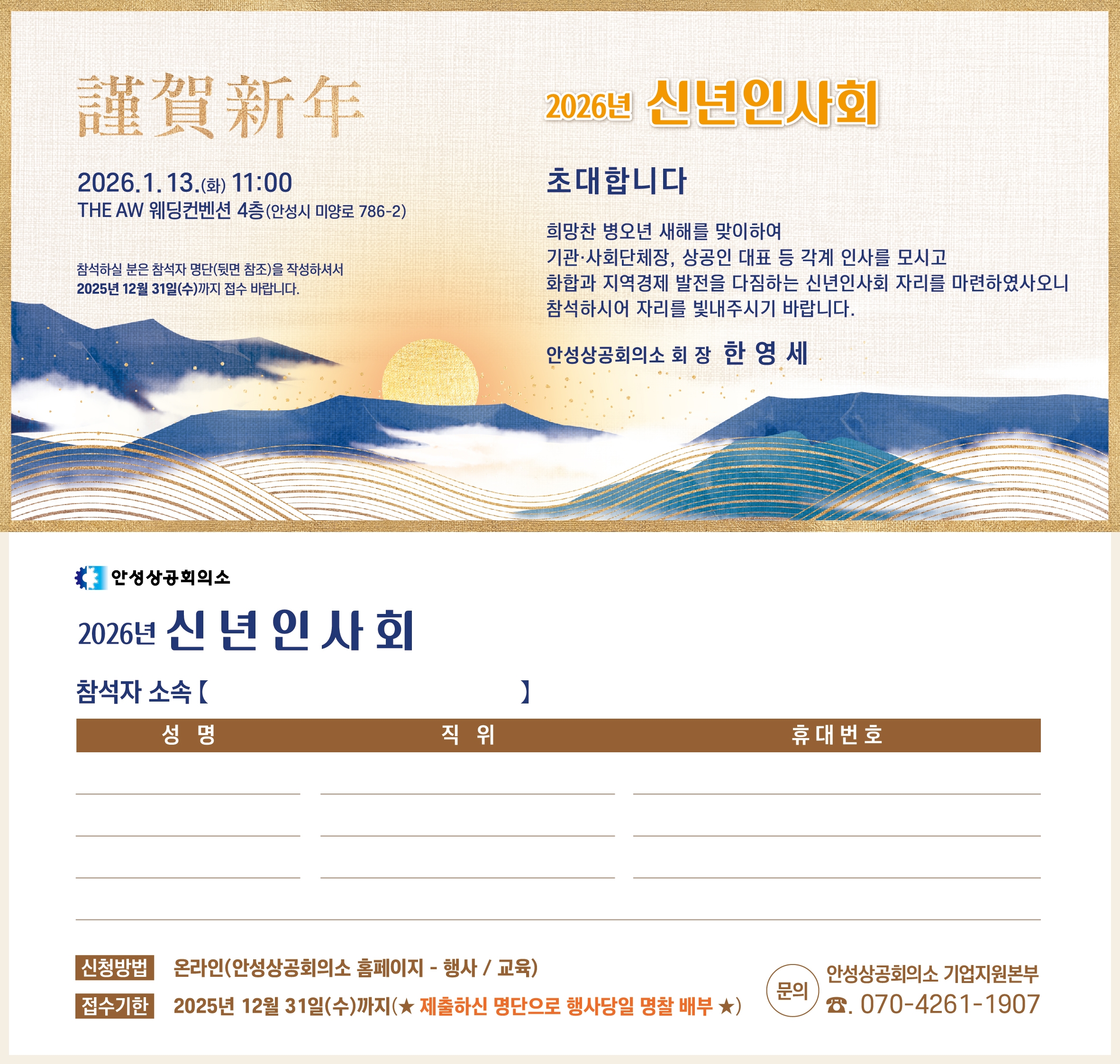 ● 일 시 : 2026년 1월 13일(화) 11:00 ● 장 소 : THE AW 웨딩컨벤션(4층) - 안성시 미양로 786-2 ● 참석하실 분은 2025년 12월 31일(수)까지 접수 바랍니다. ▶▶▶ 온라인 신청 : 홈페이지 하단 "신청" 버튼 클릭 ★ 신청하신 "소속명, 성명, 직위"으로 "행사당일 명찰이 배부"되오며, 정확한 입력 요청 드립니다. ● 문 의 처 : 안성상공회의소 기업지원본부(☎. 070-4261-1907) |